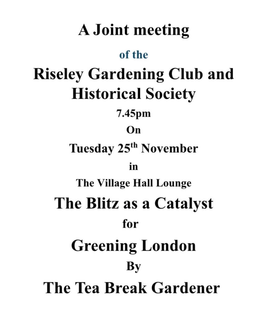 Tuesday 25th November, combined meeting with the Historical Society, The Blitz as a Catalyst for the Greening of London, by the Tea Break Gardener.