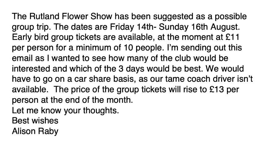 If you would like to come with us on this trip would you please let me know as soon as possible and definitely by Monday 30 January. Please let me know whether you can provide transport for others or need a lift; also if you are a member of the National Trust or the RHS.